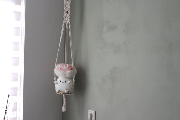 This macramé is approximately 100cm long in total. The ring on top of the art piece is 3x3cm. The wooden platform is 14cm x 11cm and therefore suited for most Mamorumori residents. If you are doubting whether your roommate will fit: do not hesitate to reach out to us.