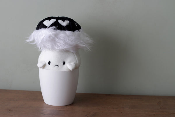 Funploms have a polyester filling and are made of local second-handed fabrics. When dirty please try to gently handwash as they are afraid of washing machines and dry cleaners. In case a washing machine is unavoidable: try to protect it with a layer and choose a handwash free setting or max 40˚C. A regular funplom is approximately 20x17x17 cm. Keep in mind that adopting a resident comes with high responsibility. They need love and care! The resident comes without attributes such as the plantpot.