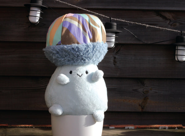 Funploms have a polyester filling and are made of local second-handed fabrics. When dirty please try to gently handwash as they are afraid of washing machines and dry cleaners. In case a washing machine is unavoidable: try to protect it with a layer and choose a handwash free setting or max 40˚C. A big funplom is approximately 39x20x20 cm. Keep in mind that adopting a resident comes with high responsibility. They need love and care! The resident comes without attributes such as the plantpot.